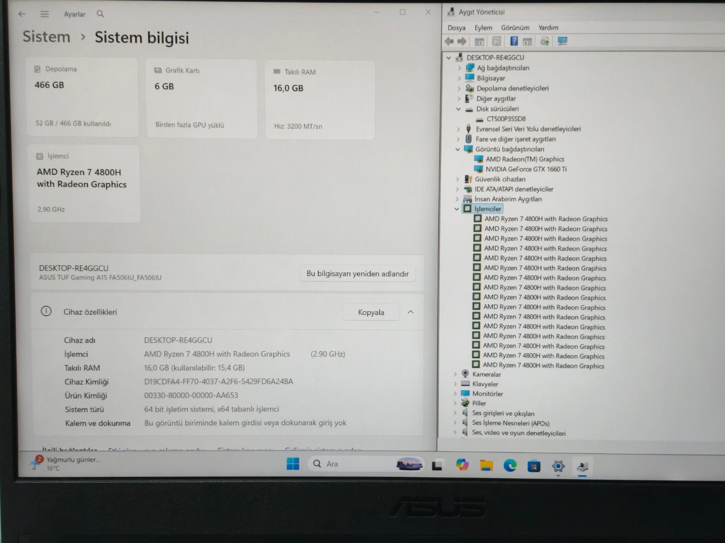 ASUS TUF FA506 RYZEN7 6GB GTX1660TI 16GB RAM TEMİZ OYUNCU LAPTOP