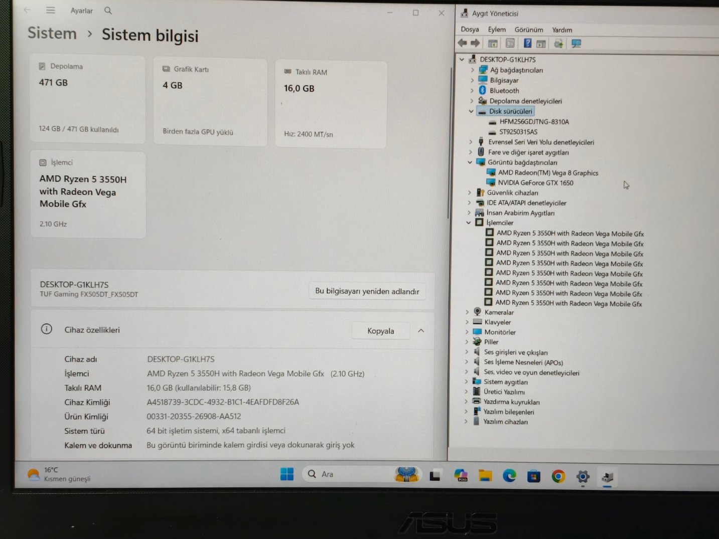 ASUS TUF FA506 RYZEN7 6GB GTX1660TI 16GB RAM TEMİZ OYUNCU LAPTOP